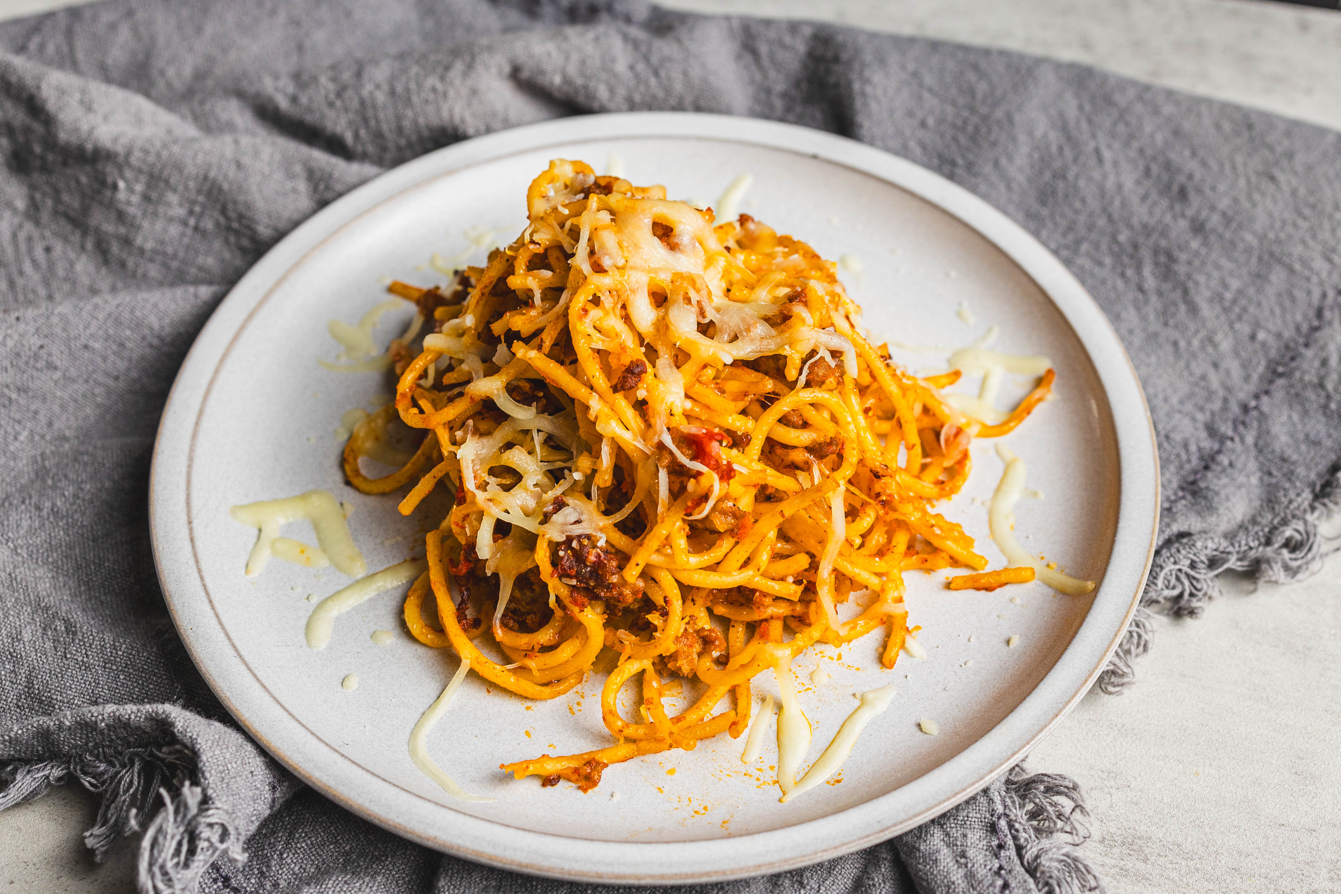 Step 6 -Pour 1/2 of the spaghetti mixture into the prepared casserole dish then lightly pack it down. Sprinkle it with 1 cup of the mozzarella cheese. Repeat the layers once.