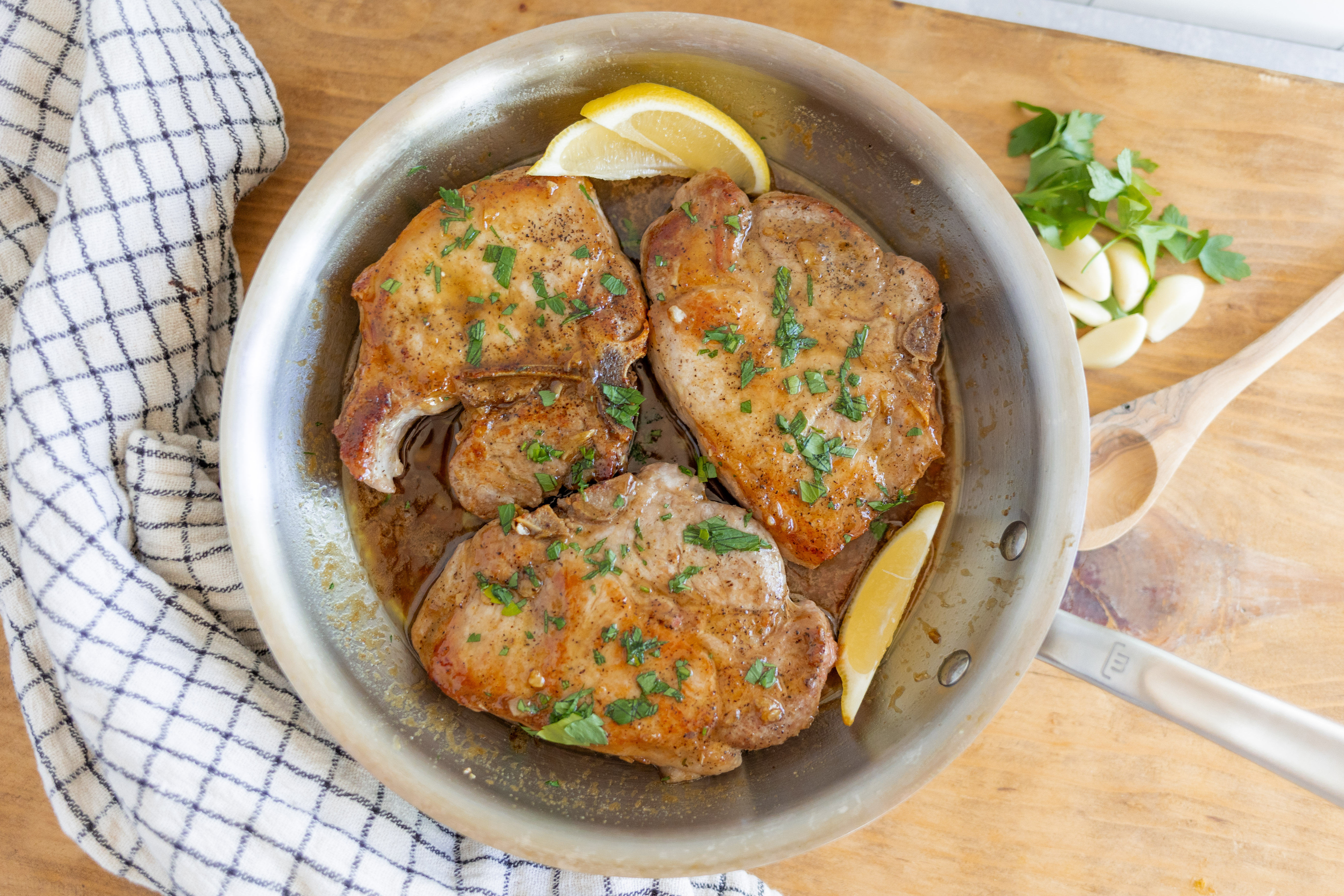 Step 8 -Add the browned pork chops to the pan and spoon the butter mixture over them.