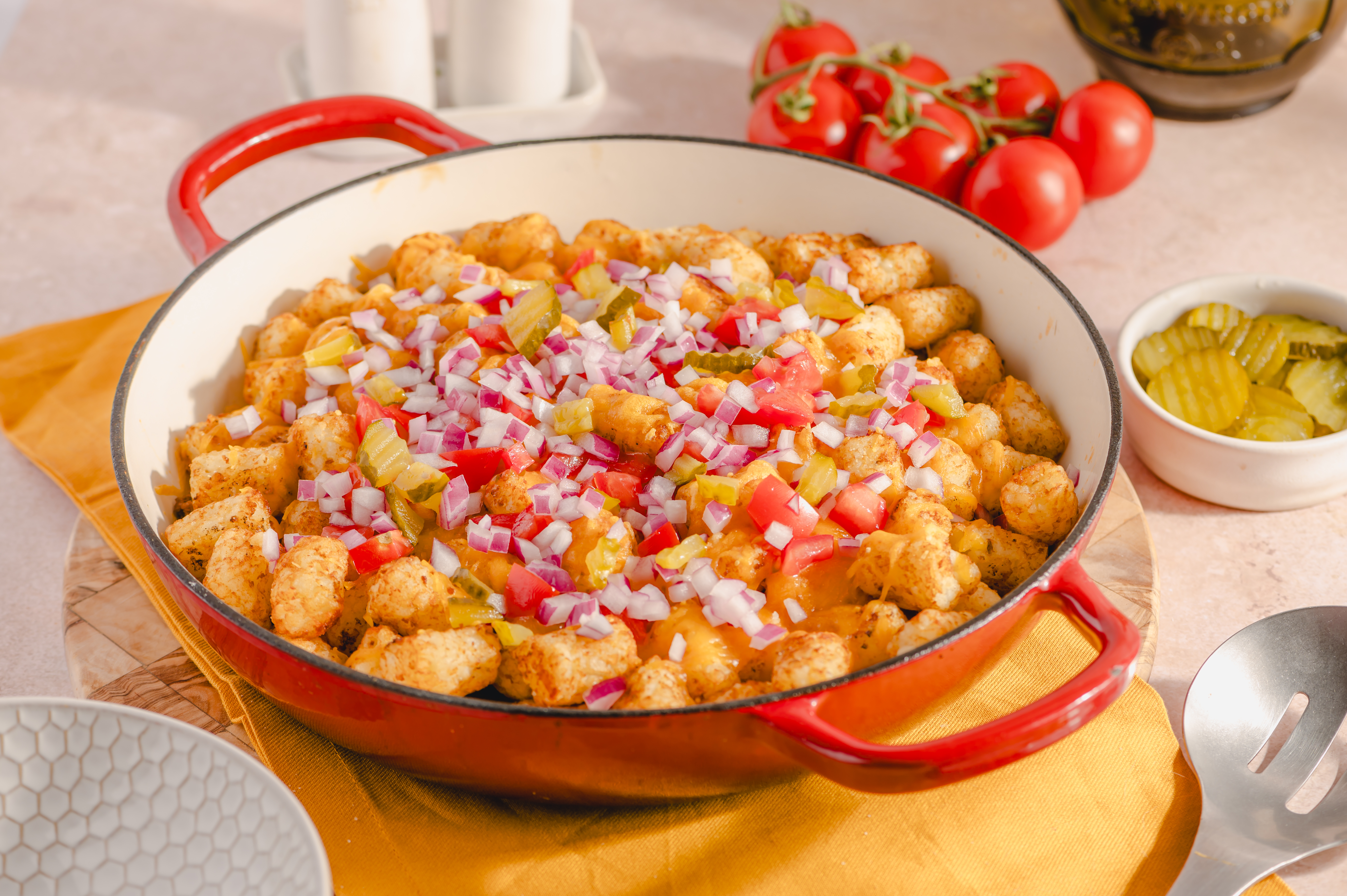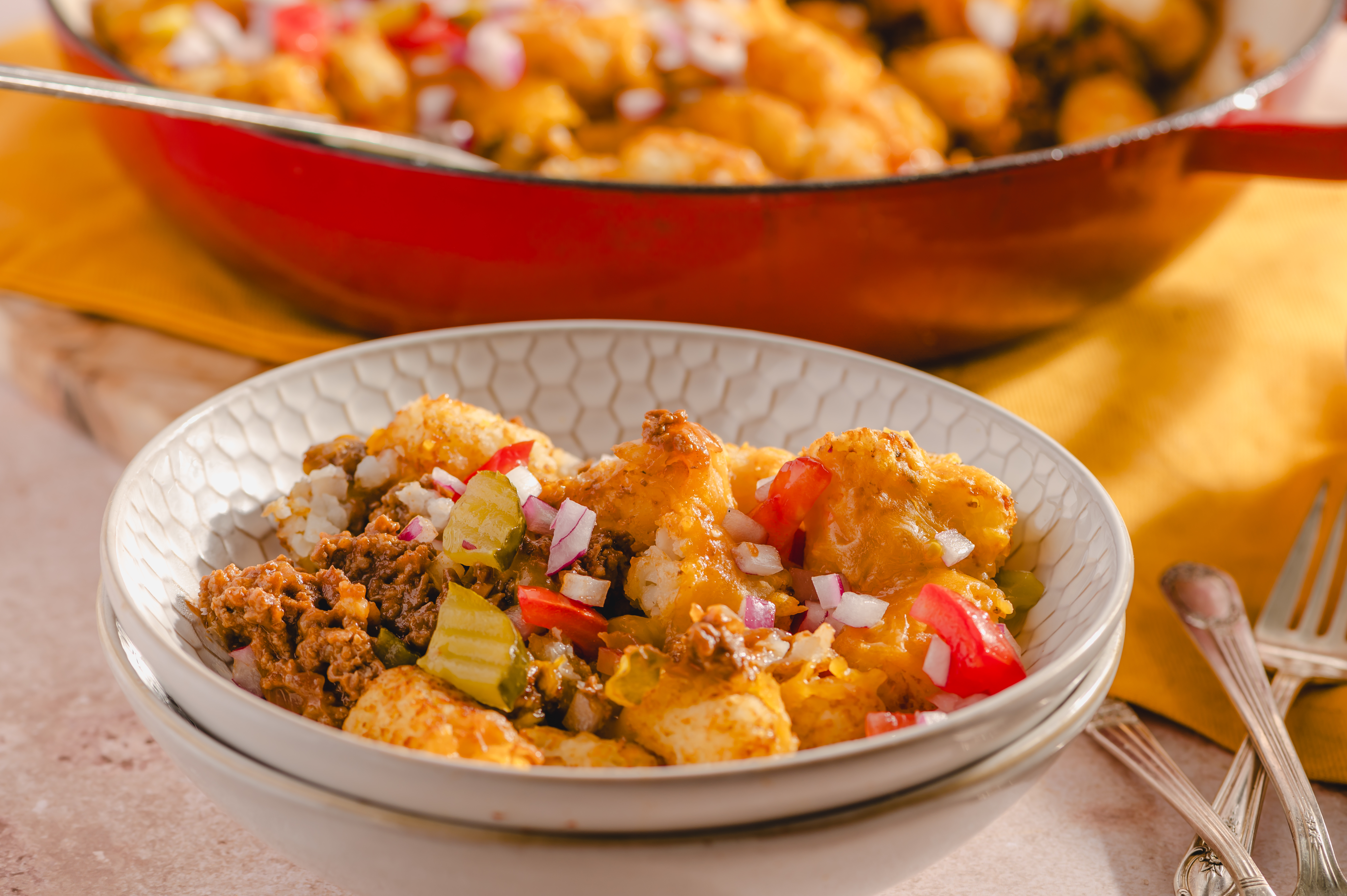 The Cheeseburger Skillet — country home-cooking with a classic diner feel! Juicy, savory beef packed with notes of deeply rich tomato and sour pickles, tastes just like the best kind of burger. Of course, it wouldn't be a Cheeseburger Skillet without just so much melty, sharp cheese! That this dish comes prepared with crispy tots and a burger sauce? Well that just ensures you don't miss out on any of the best burger experiences!