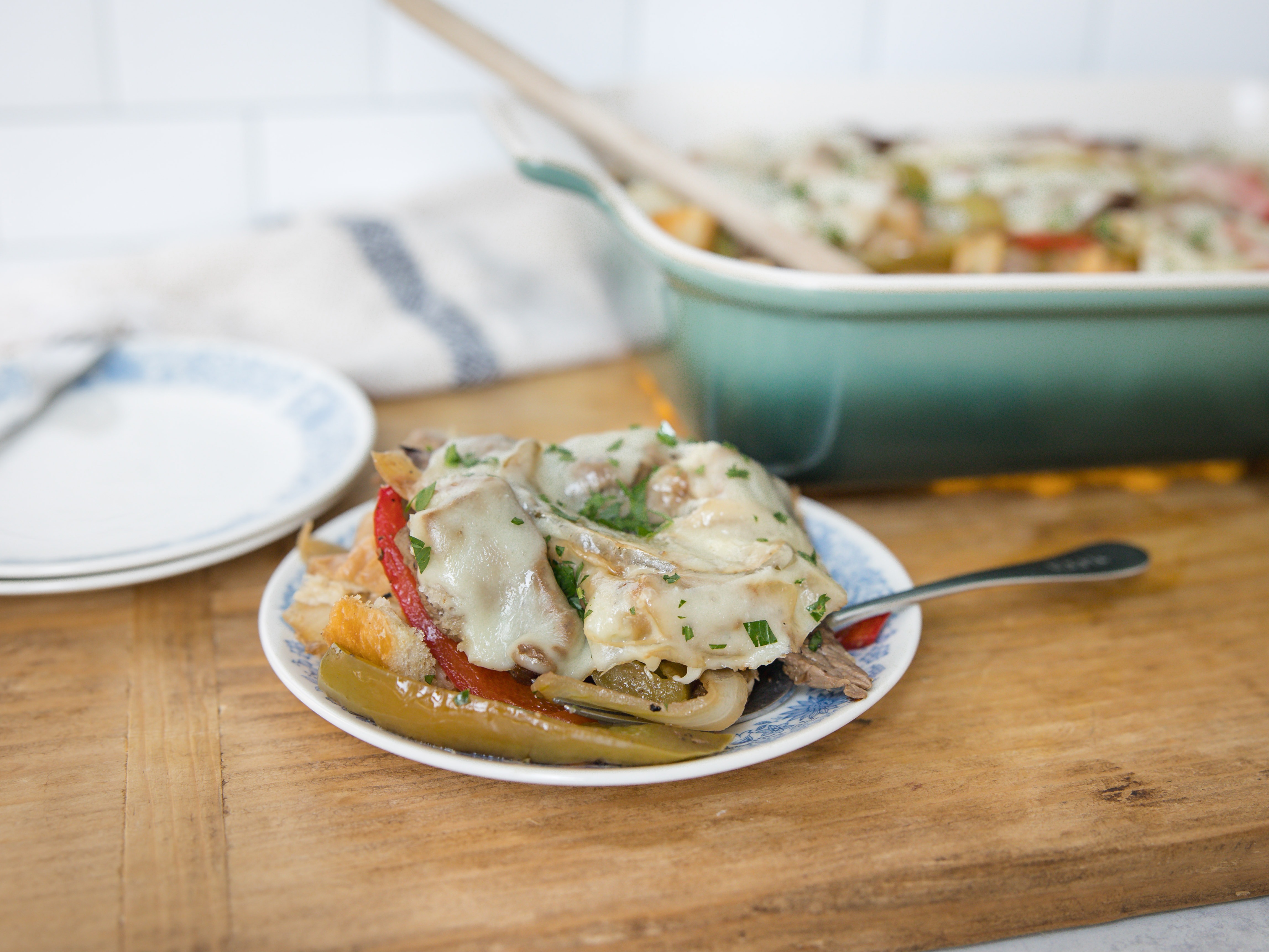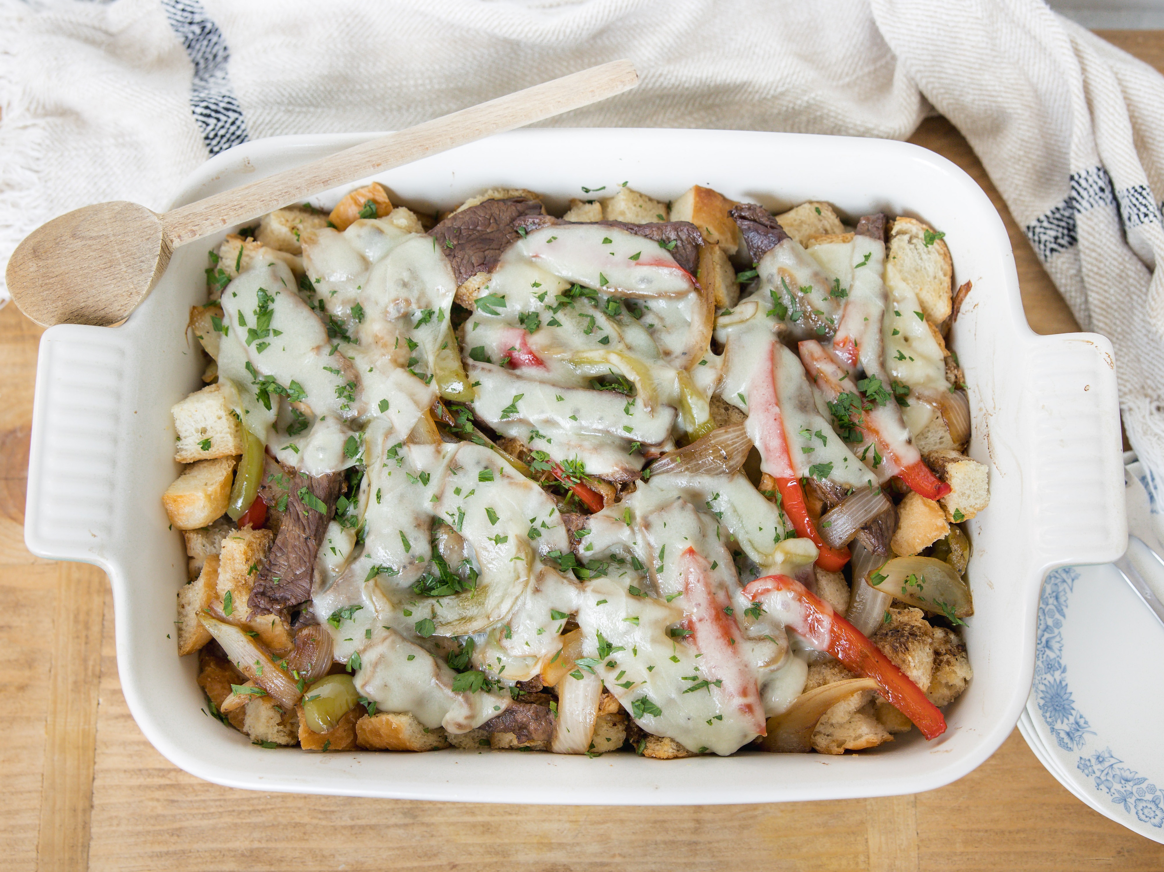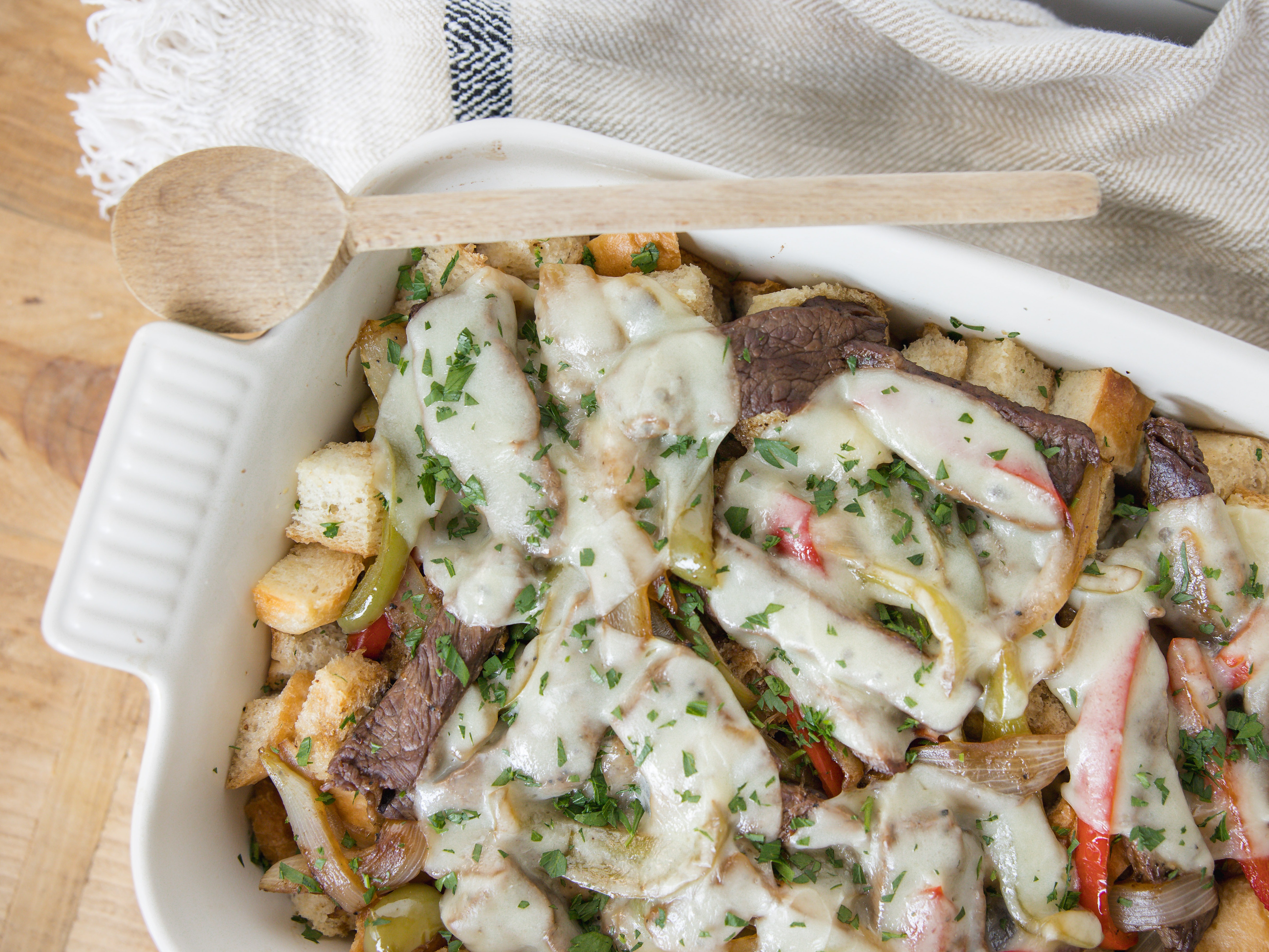 Is your mouth watering yet? Just take a look at the pictures of Cheesy Steak Bake and it'll happen in seconds. What's not to love about juicy, tender steak, refreshing, flavorful peppers, and toasted hoagie roll cubes layered on top of each other with slices upon slices of melty provolone?! It's sort of like all your favorite parts of a Philly cheesesteak sandwich got chopped up and thrown in a dish. Doesn't that sound incredible? Well, it is! Give into your craving and make the Cheesy Steak Bake!