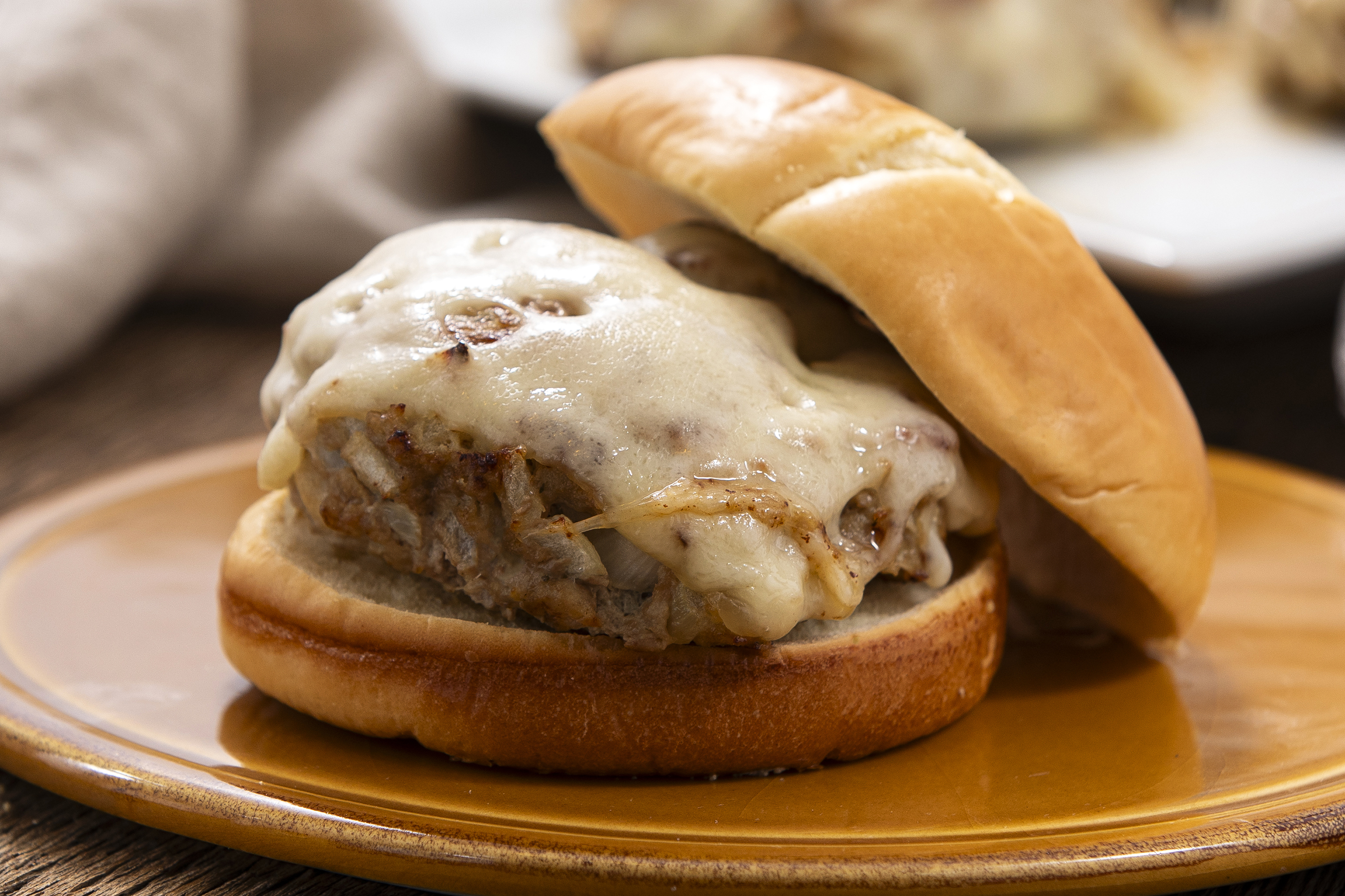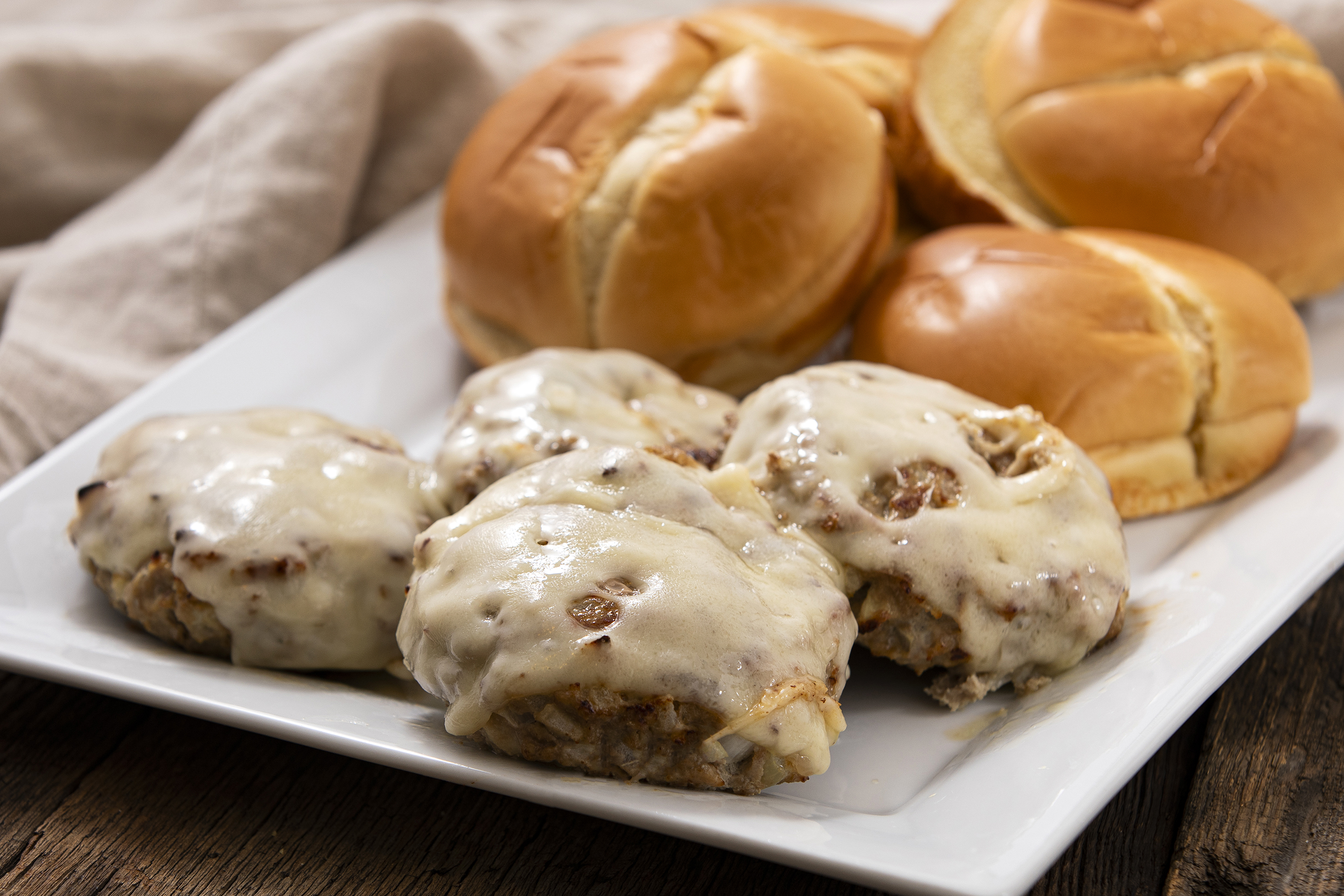 This is the burger for those questioning whether a turkey burger could ever compete with a beef burger. It can and, with this Country Turkey Burger, it will! The meat is juicy and savory, mixed with fragrant garlic and zesty ranch, pan seared for a crisp exterior, and topped with melty and nutty Swiss cheese. Served on a hamburger bun, Country Turkey Burger is how to make burger night about more than just the beef!