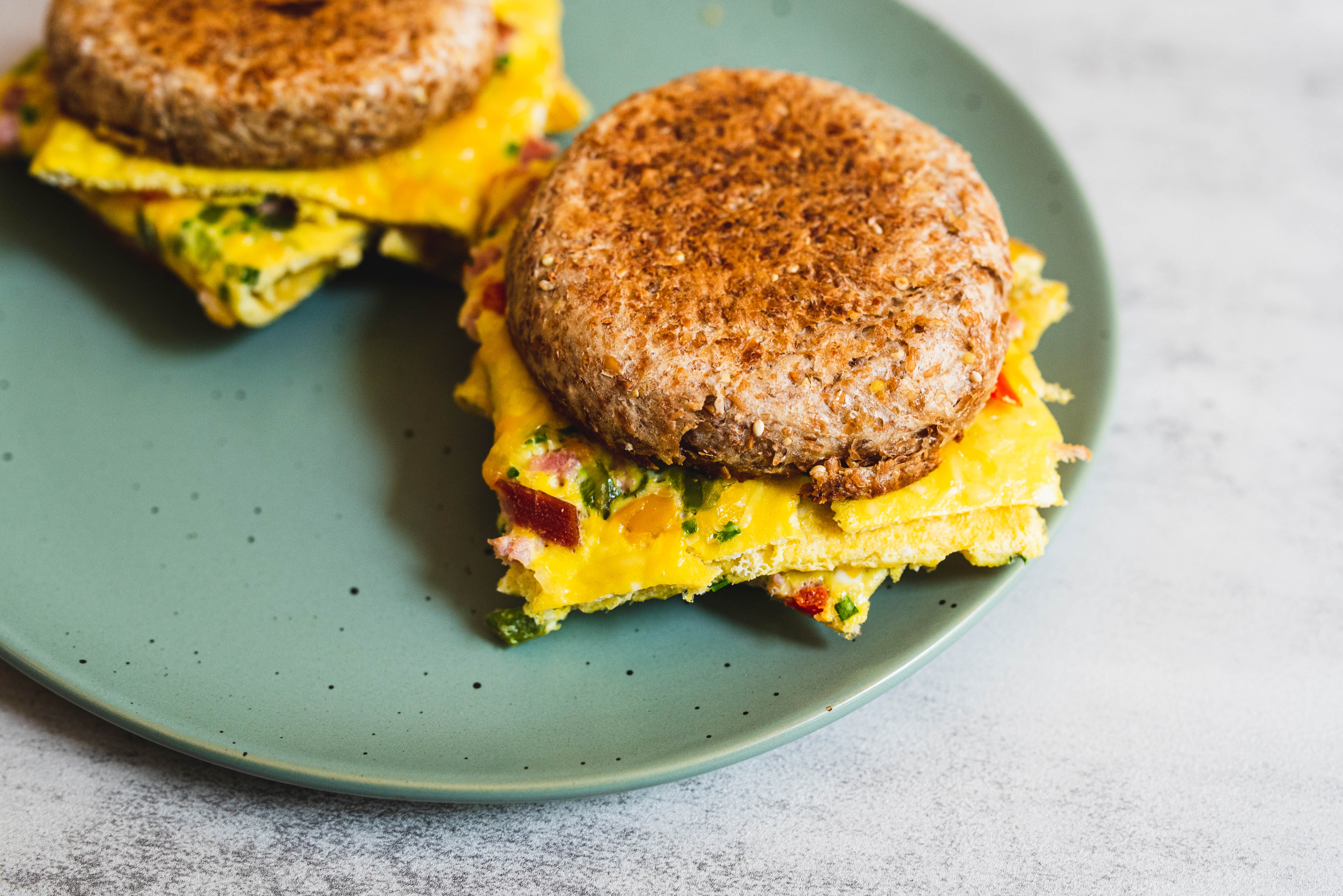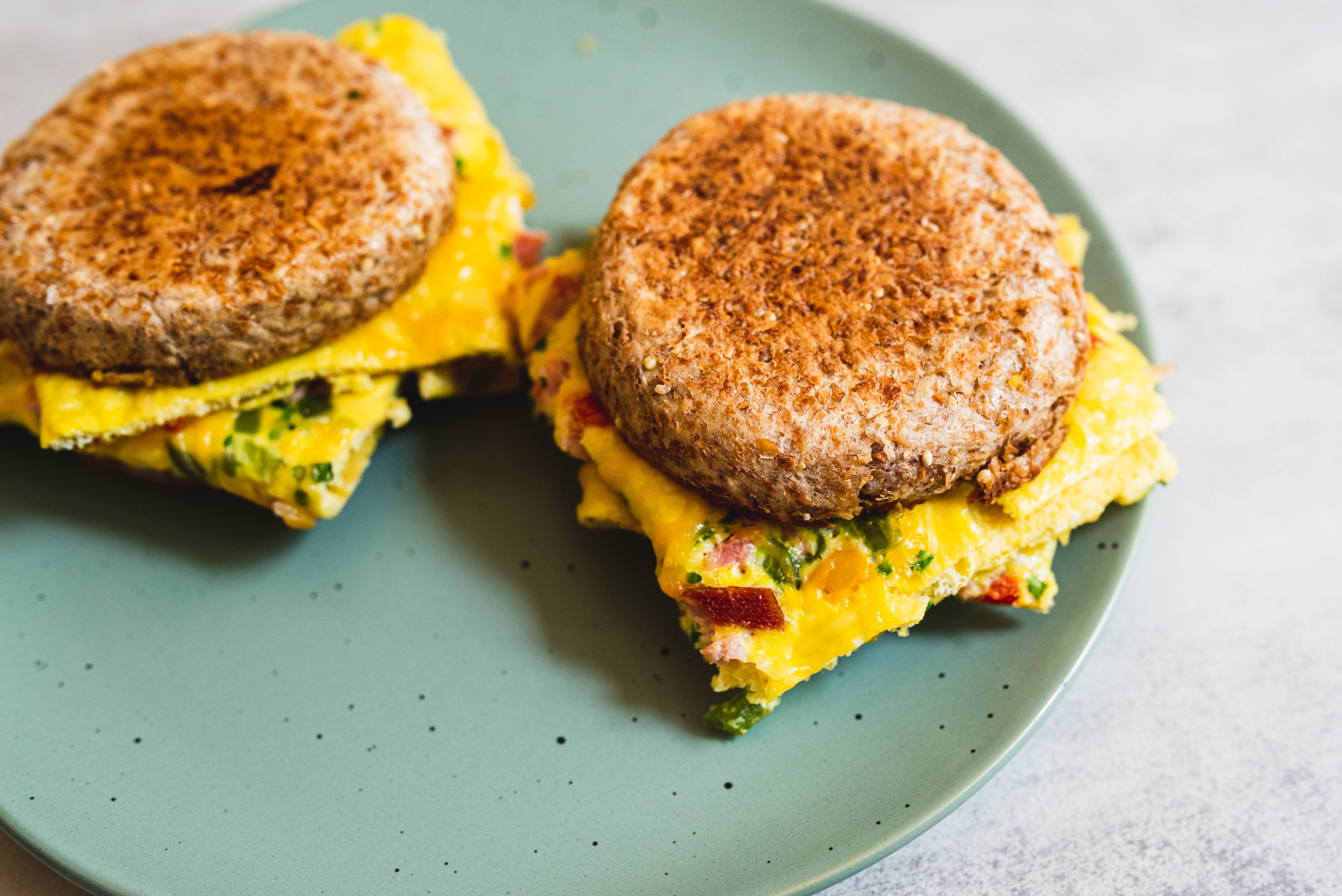 Whether you're on the go or just want something simple, these Easy Egg Sandwiches are the best way to get your morning going! Grab yourself a few crunchy, perfectly toasted, and thoroughly buttered English muffins and pile them with an omelet-like square filled with melty cheese, hearty ham, crunchy green pepper, and fresh chives. It's the perfect handheld for any kind of day! Easy Egg Sandwiches are the no mess, low stress bite you need to start off any day! It's going to be "egg-cellent!"