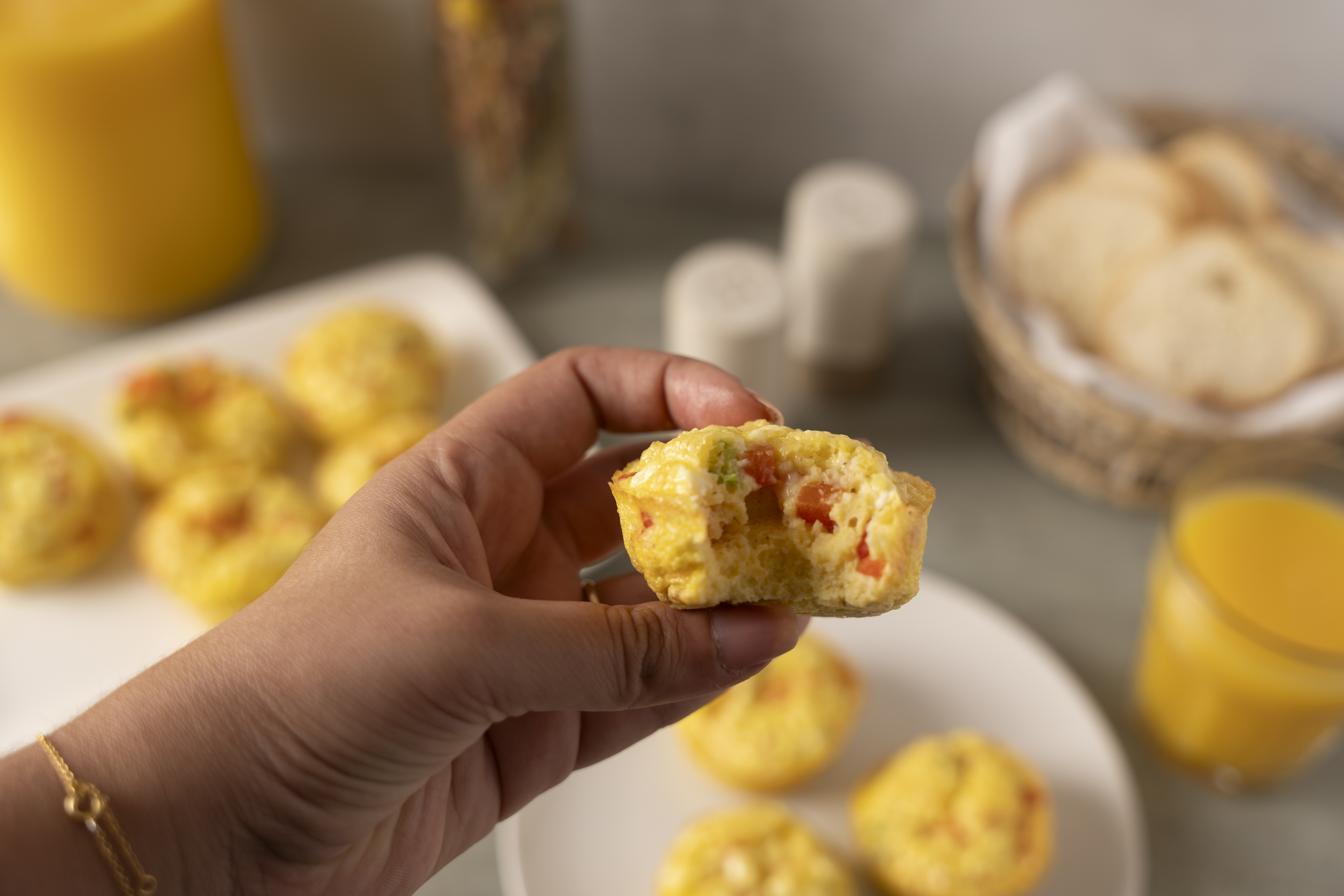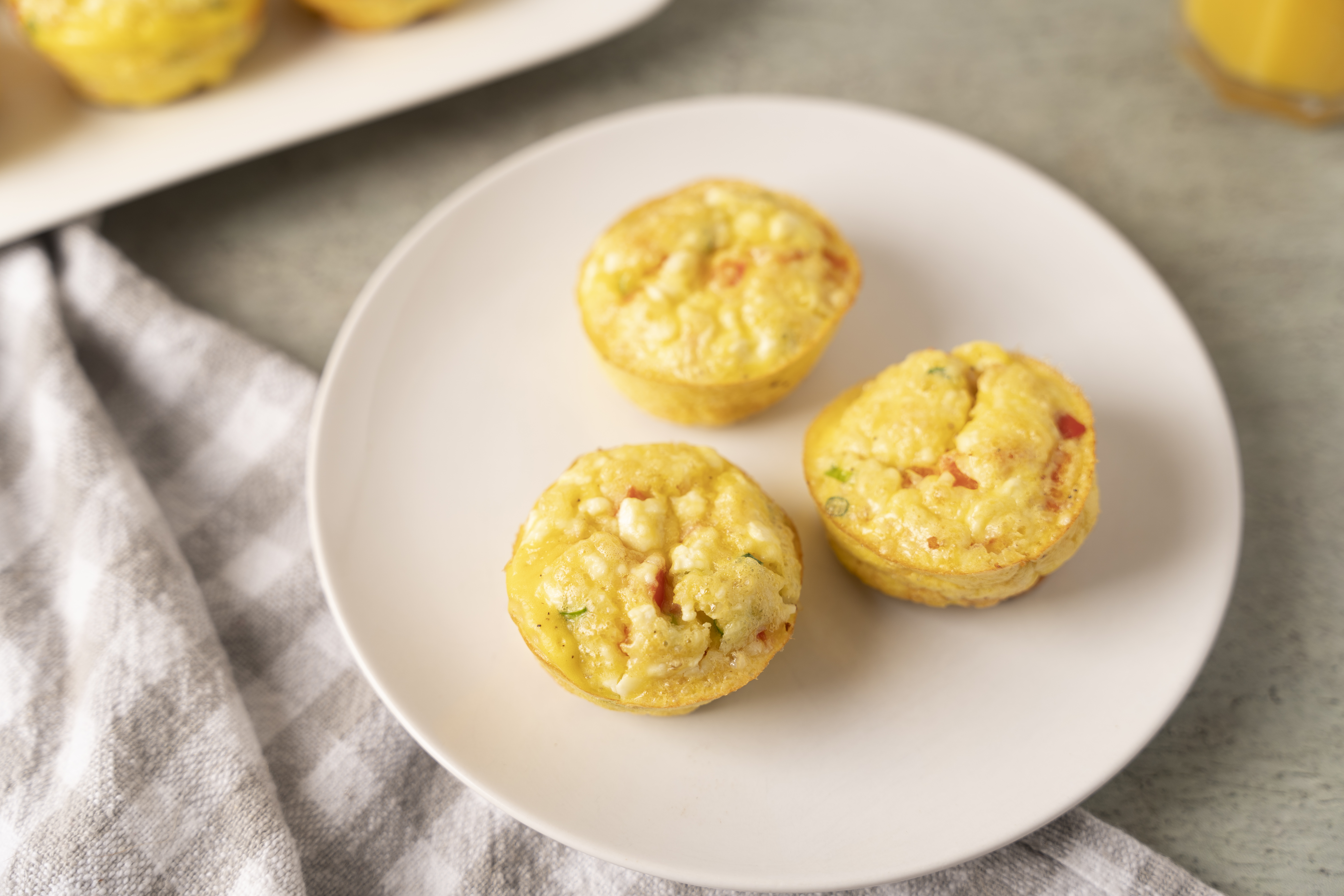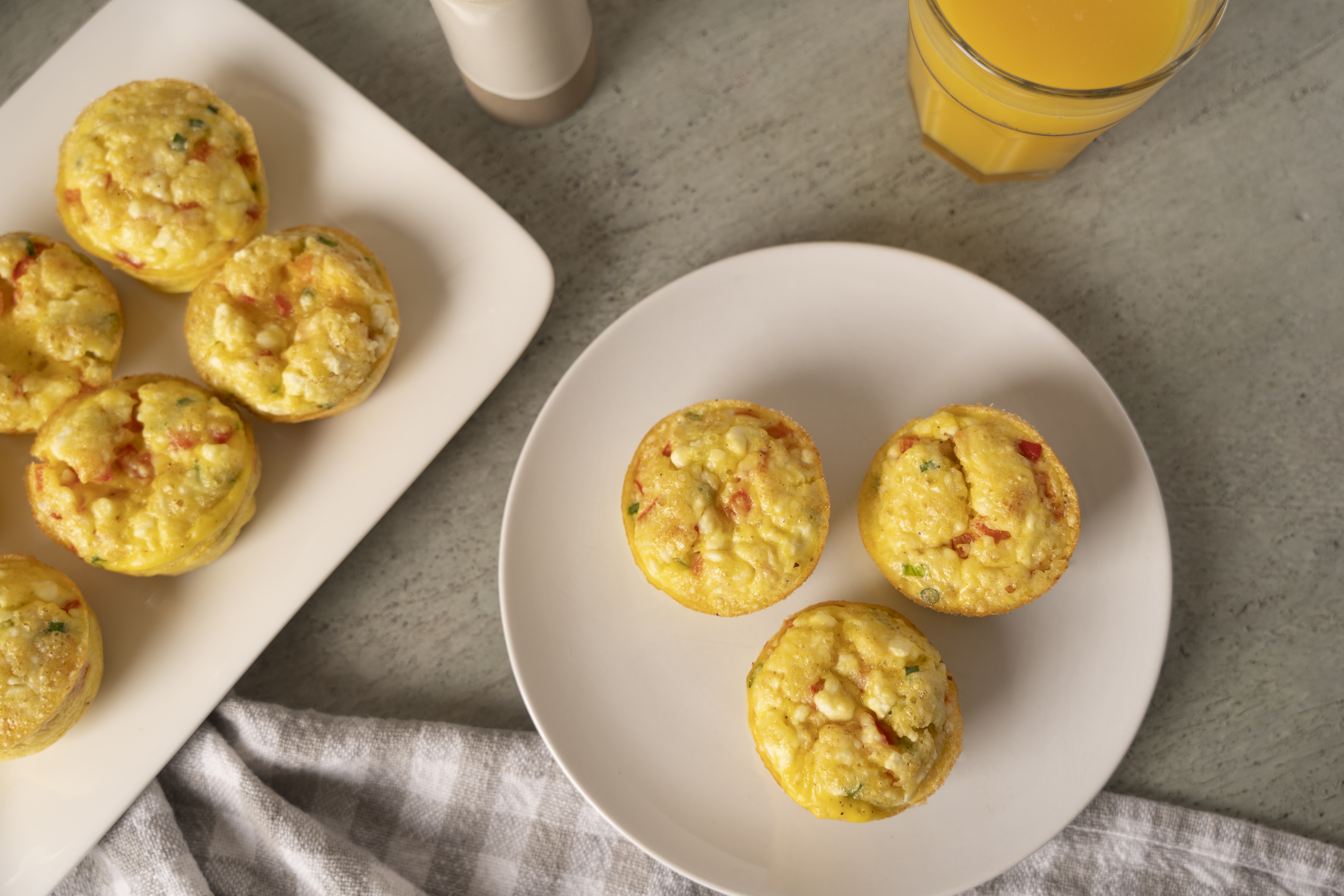 Egg Muffins are a great way to get your morning egg fix on the go! Carry them in a little resealable bag and get bites of tender egg, with plenty of sharp feta and fresh, bright veggies baked right in! Better yet, they are ready in just over half an hour! Grab a few Egg Muffins and feel that powerful protein punch get you up and moving!
