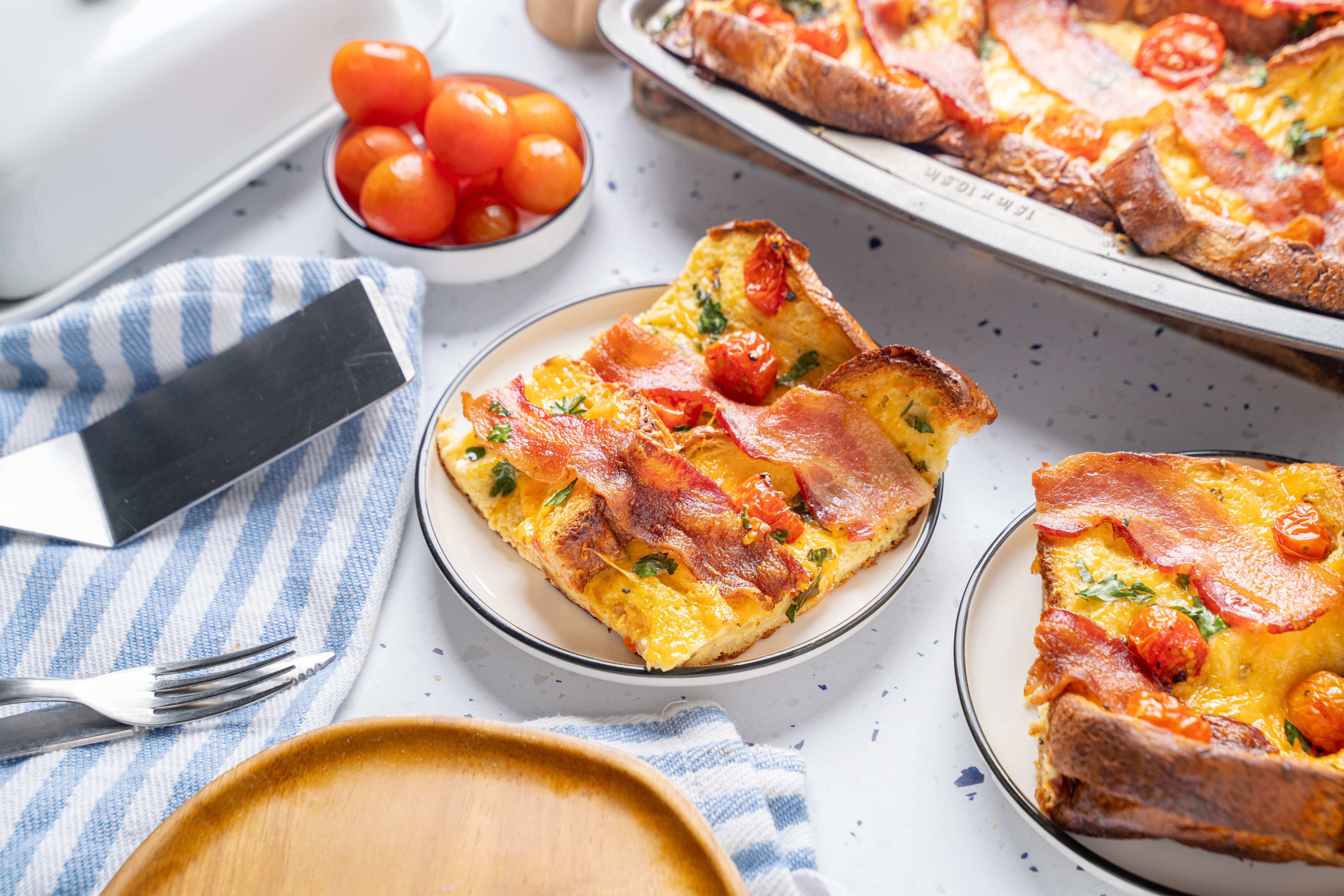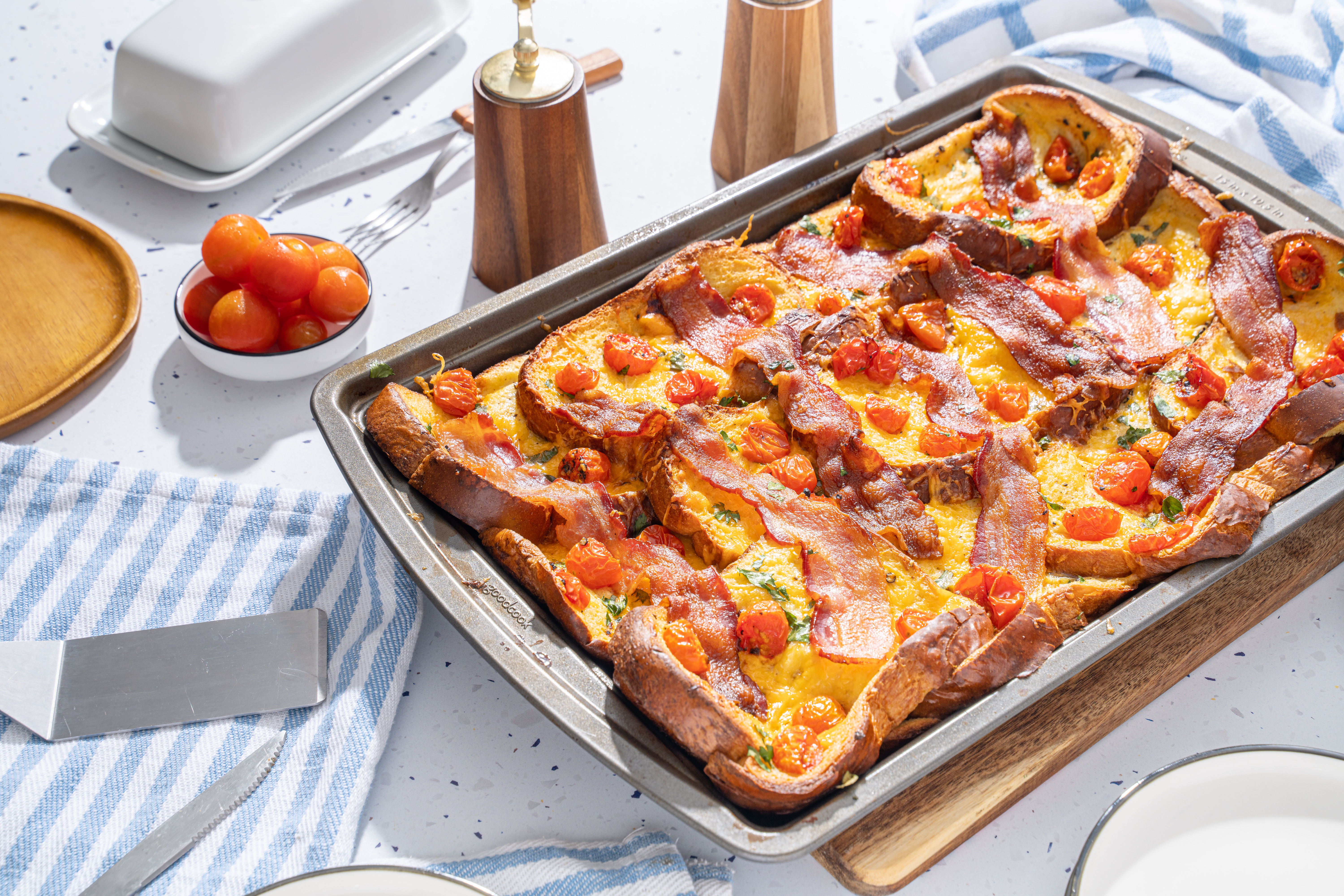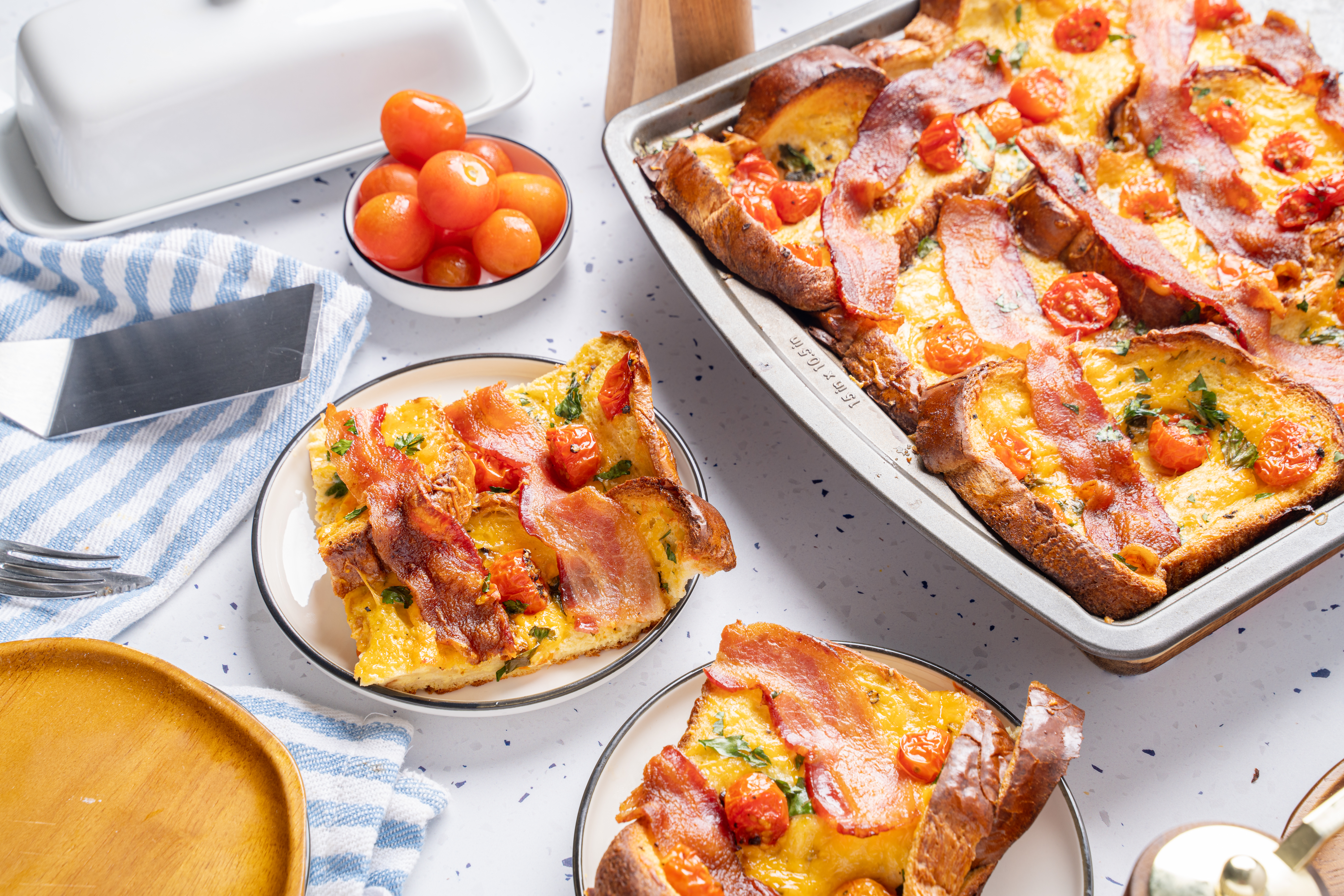 Would you believe?! The real reason Old MacDonald had a farm wasn't just so he could learn all of the farm animal sounds... it was really so he could have the excuse to start his mornings off with this Farmer's Favorite Breakfast Bake! And can you blame him? Before he heads out for the day to hear a moo, moo there, he's going to be right here chowing down on this savory version of French toast! Having these yummy bread slices soaked in a creamy sauce loaded with plenty of melty cheese, fluffy eggs, juicy tomatoes, and of course, crispy bacon is the best way to start any day... whether you're down on the farm or not! The man knows what's up (and also an array of animal noises), so trust him! Farmer's Favorite Breakfast Bake will have you singing "e-i-e-i-o" for the rest of the day!