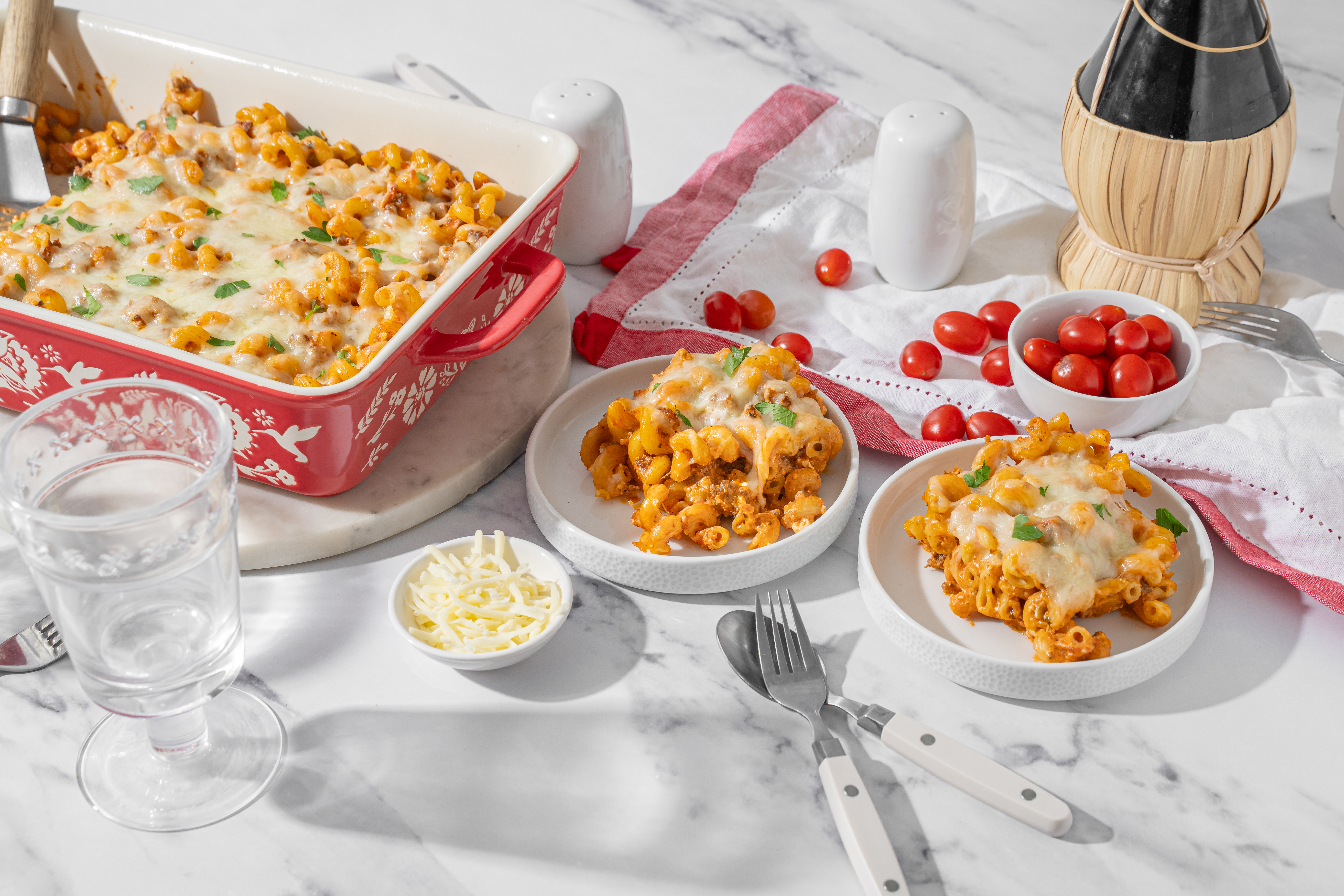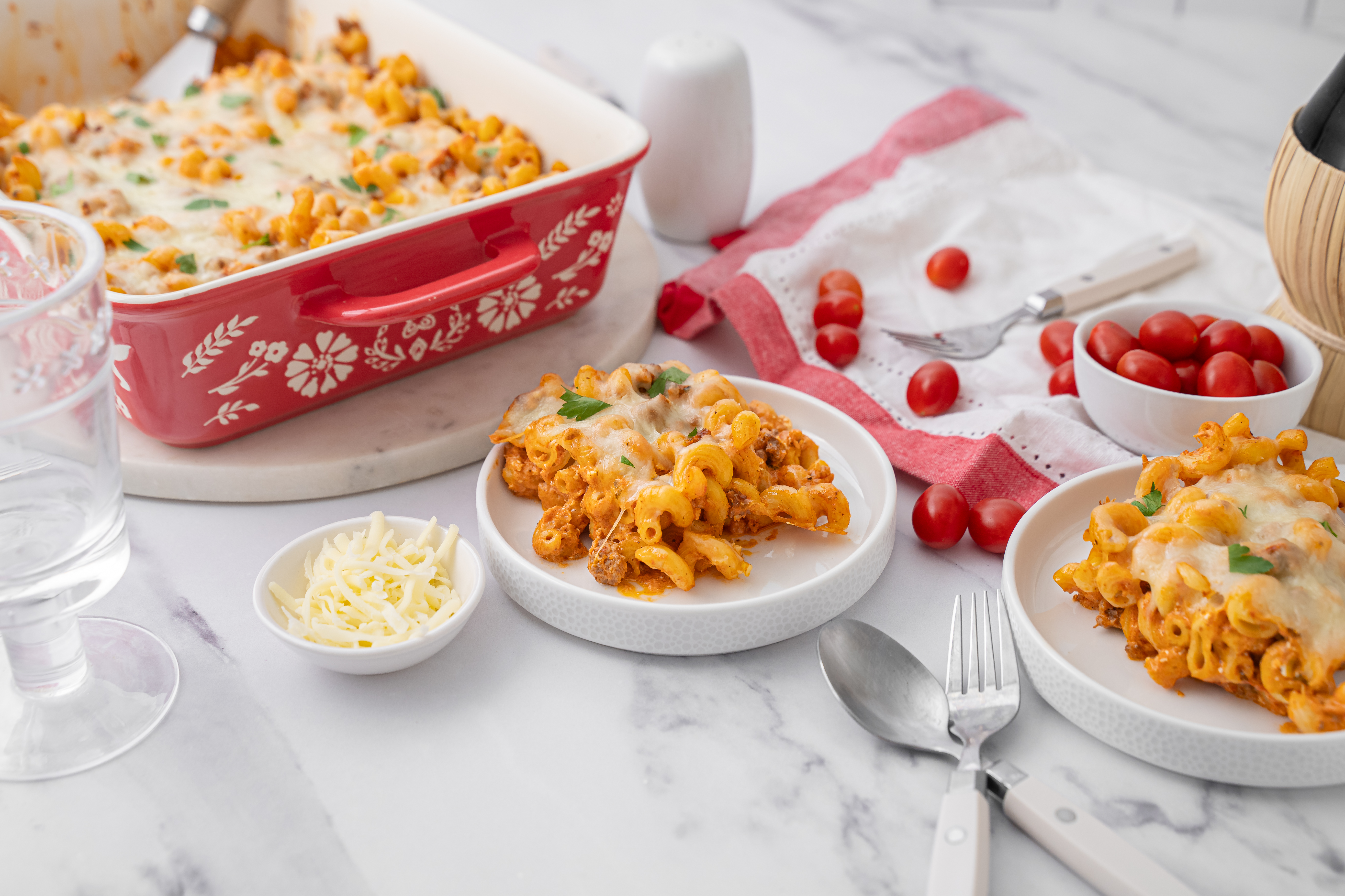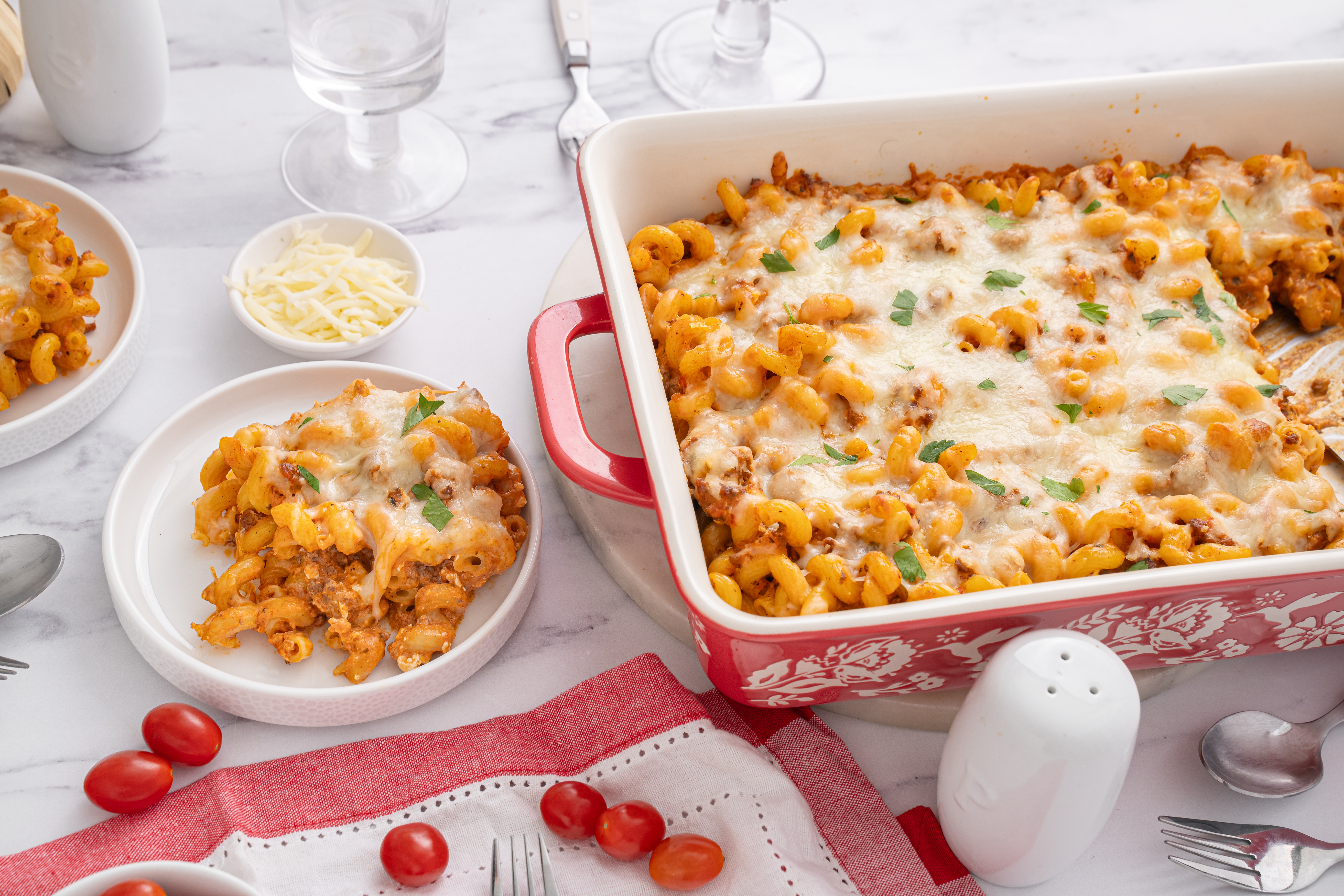 Who doesn't love a great Italian-inspired meal? For-the-Love-of-Pasta Bake is an exceptional way to satisfy your al dente-loving soul! When cavatappi pasta is topped with a creamy, tomato-saucy ground beef mixture and mozzarella cheese and then baked until bubbly... well, it becomes a truly comforting delight! Add a loaf of Italian bread and For-the-Love-of-Pasta Bake will be a welcomed favorite dish at any gathering. Now, that's Italian!