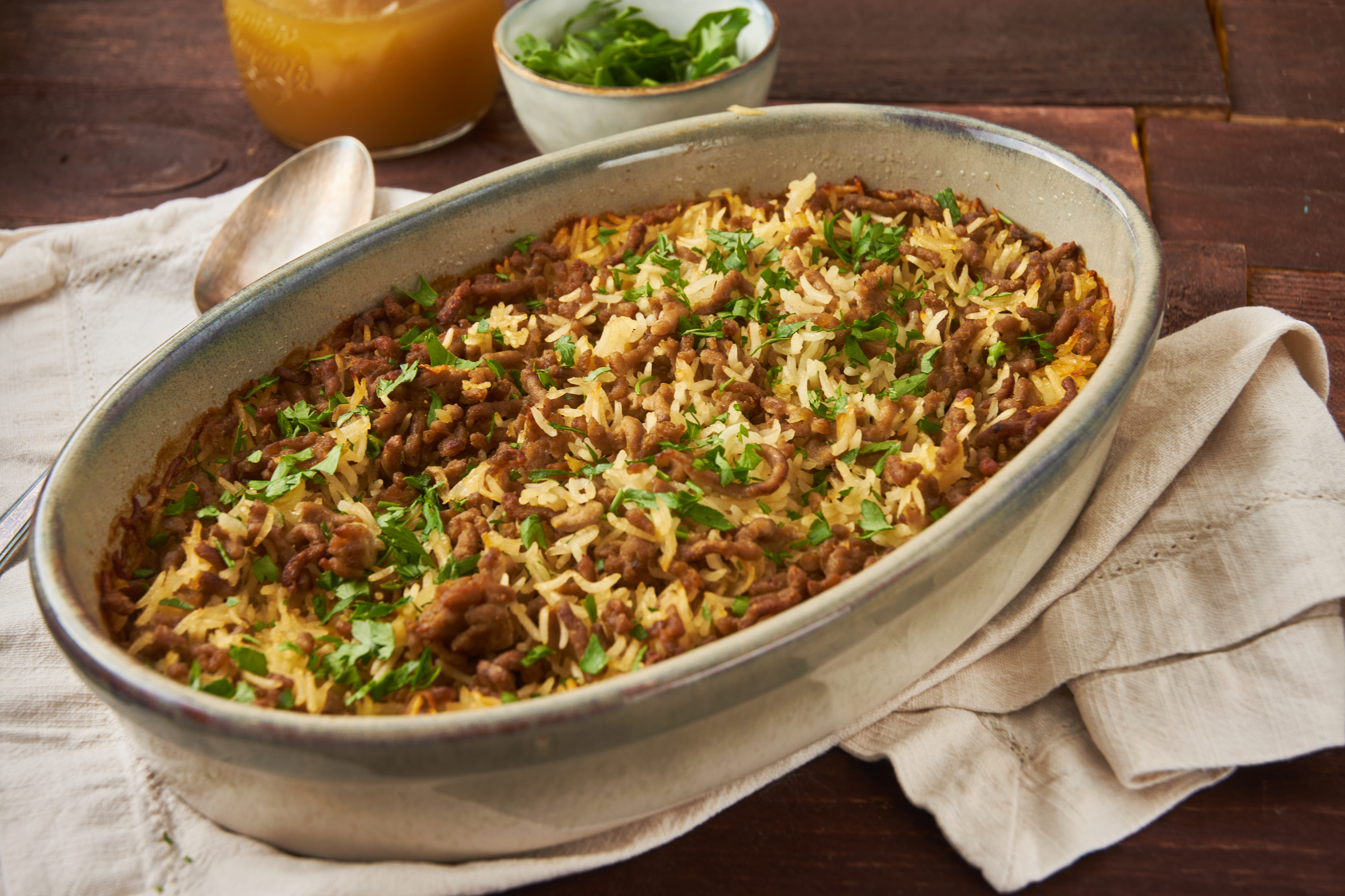 Step 5 -In the prepared baking dish, add the rice and the seasoned ground beef.
