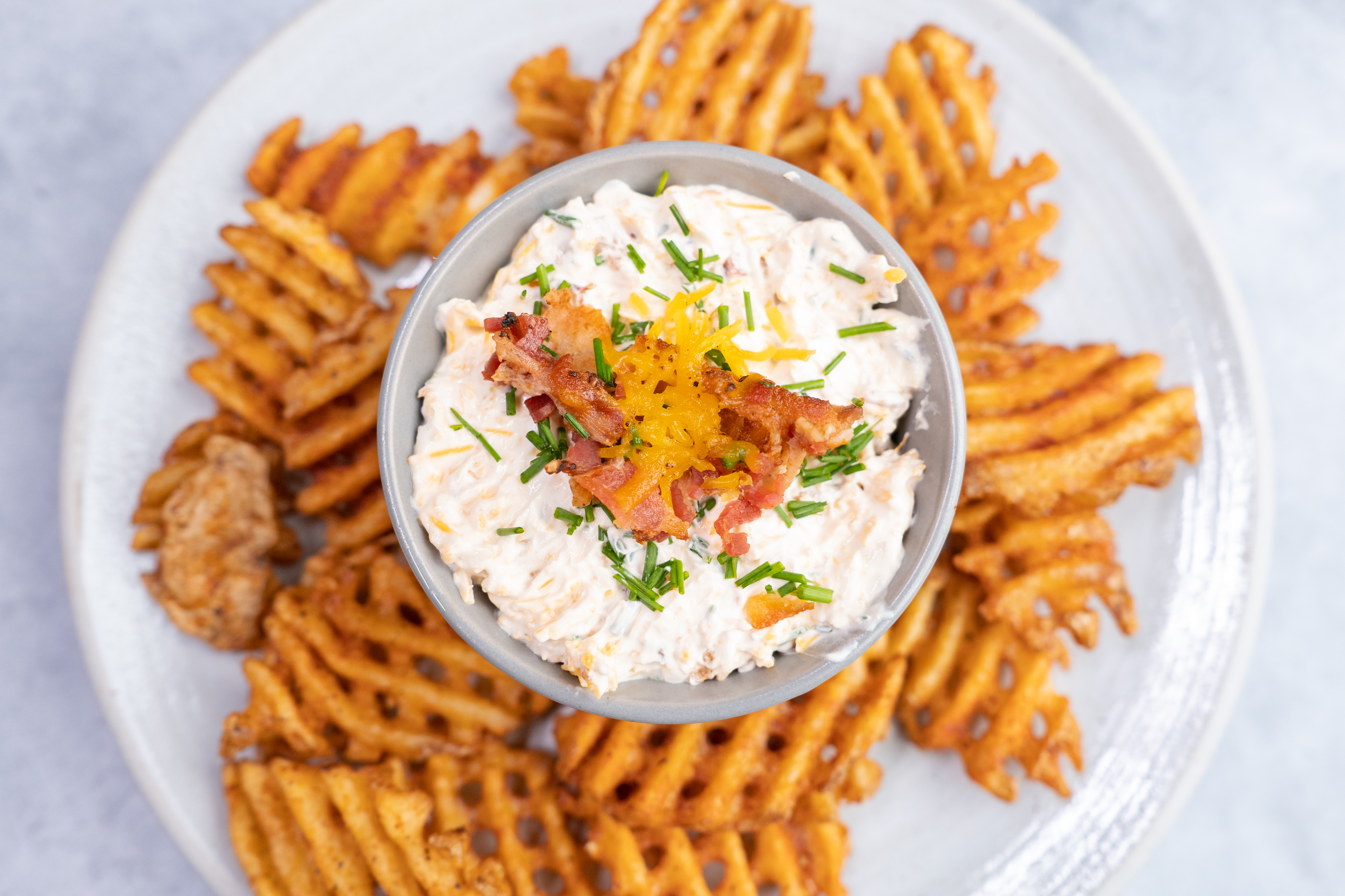You read that right, this is a Loaded Baked Potato Dip! Get your crispiest waffle fries ready because this rich, creamy dunker is gonna get scooped up in a jiff. The title isn't lying about the "loaded" part either. You can count on every last bite to explode with salty cheddar cheese, crispy chopped bacon, freshly minced chives, and a kick of some spicy Louisiana-style hot sauce! Sounds like a party for your taste buds, huh?! Loaded Baked Potato Dip is filled to the brim with flavorful fun!