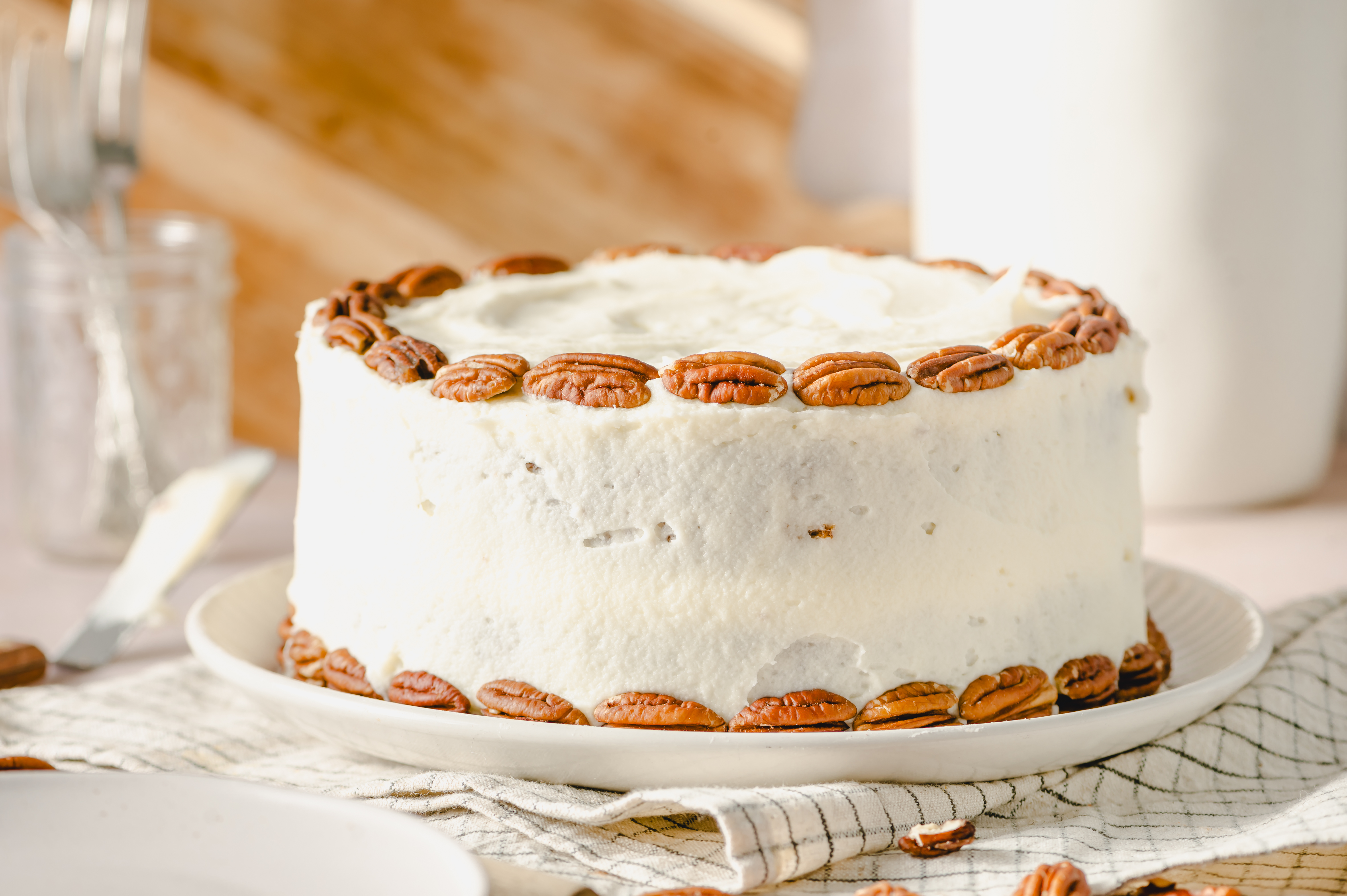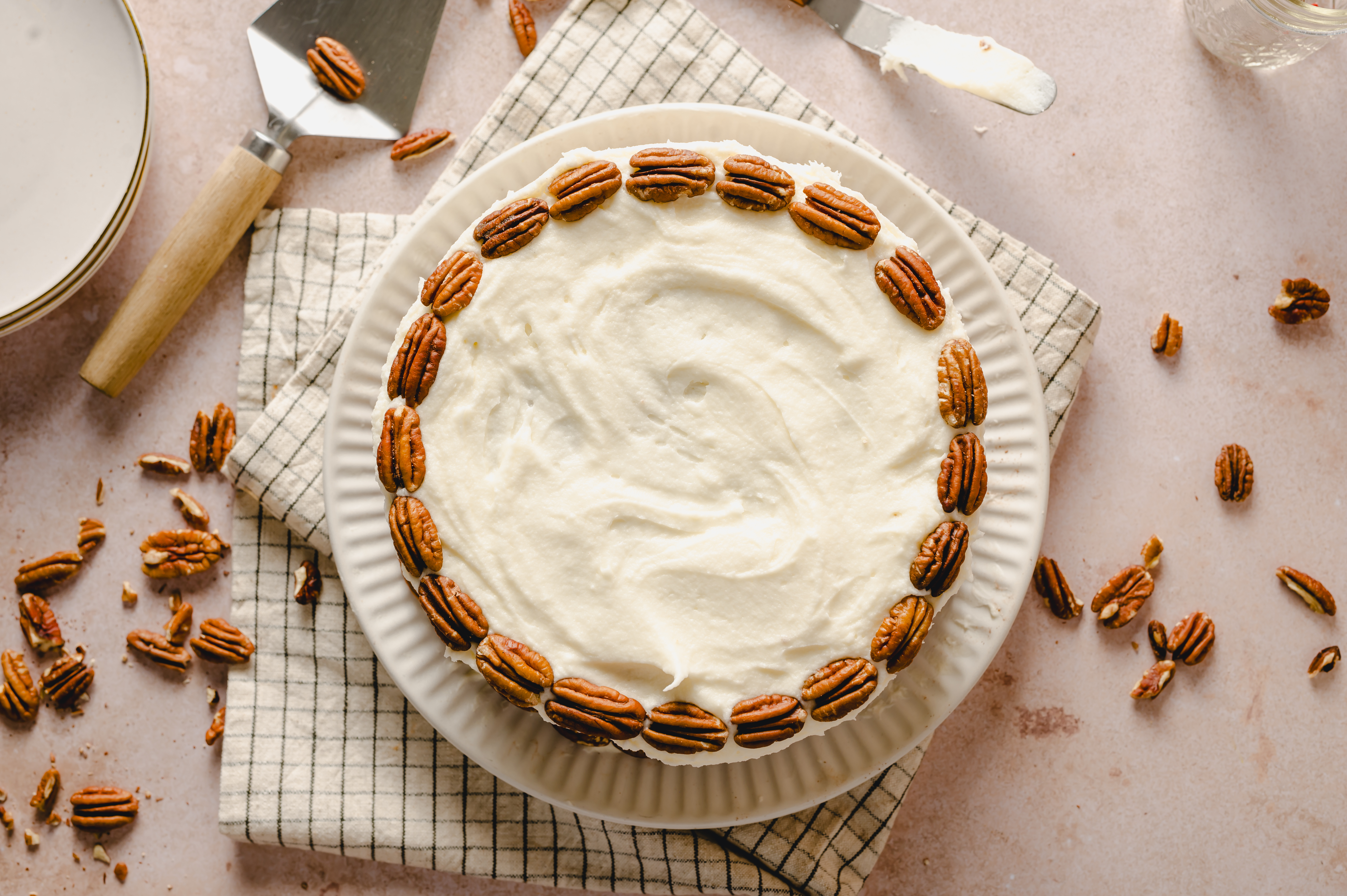Step 14 -Press the remaining pecan halves along the base and around the top of the cake to create a decorative ring.