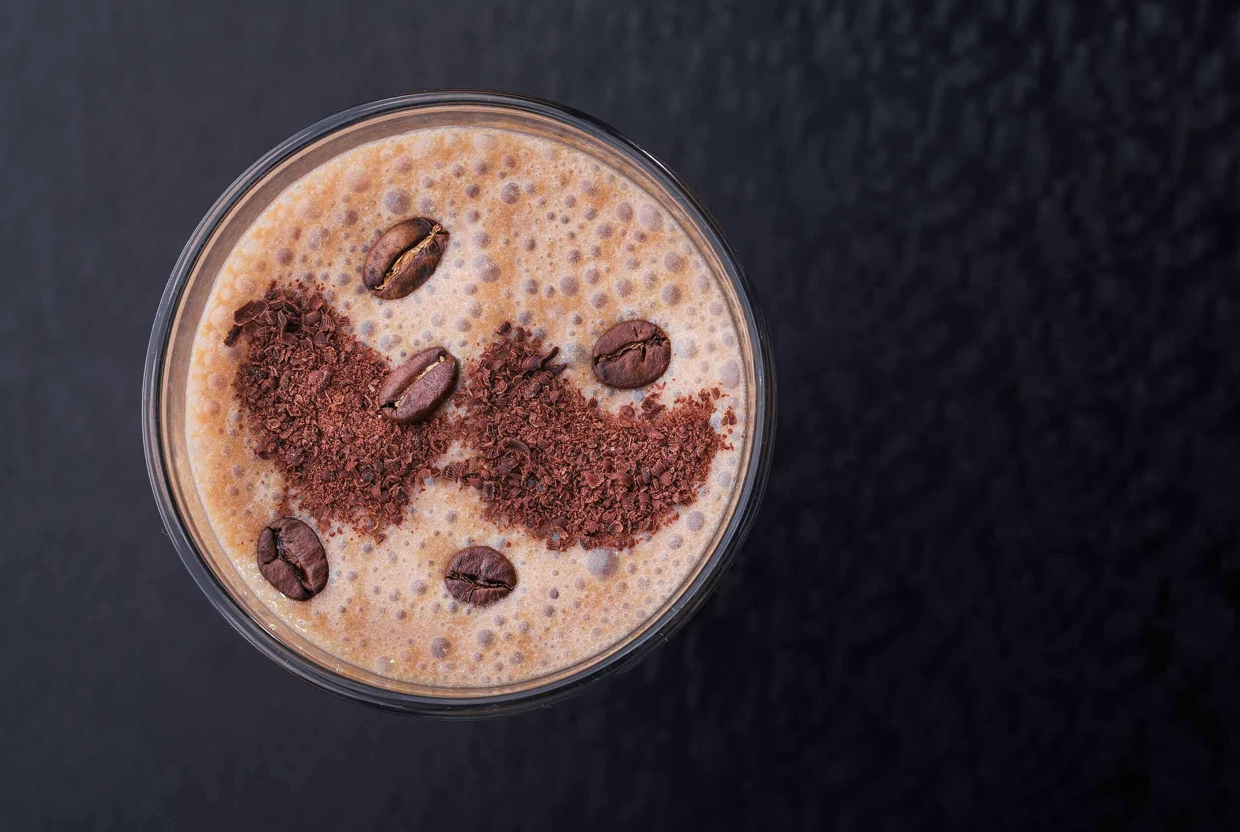 Step 1 -In a large, high-powered blender, add the coffee, the banana, the vanilla, the peanut butter, the ice, 1/4 cup of the coconut milk, 1/2 tablespoon of the cacao powder, and the protein powder.