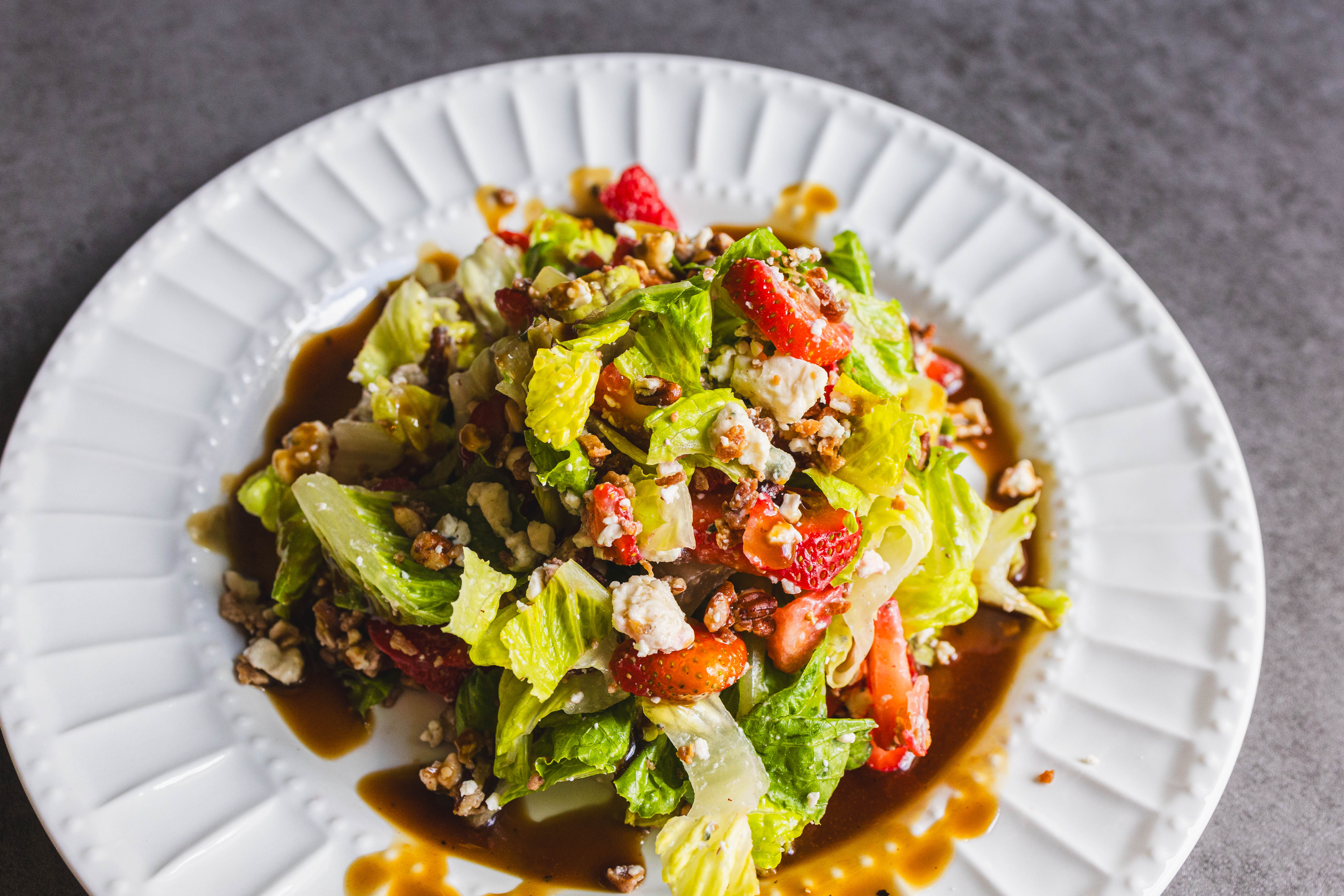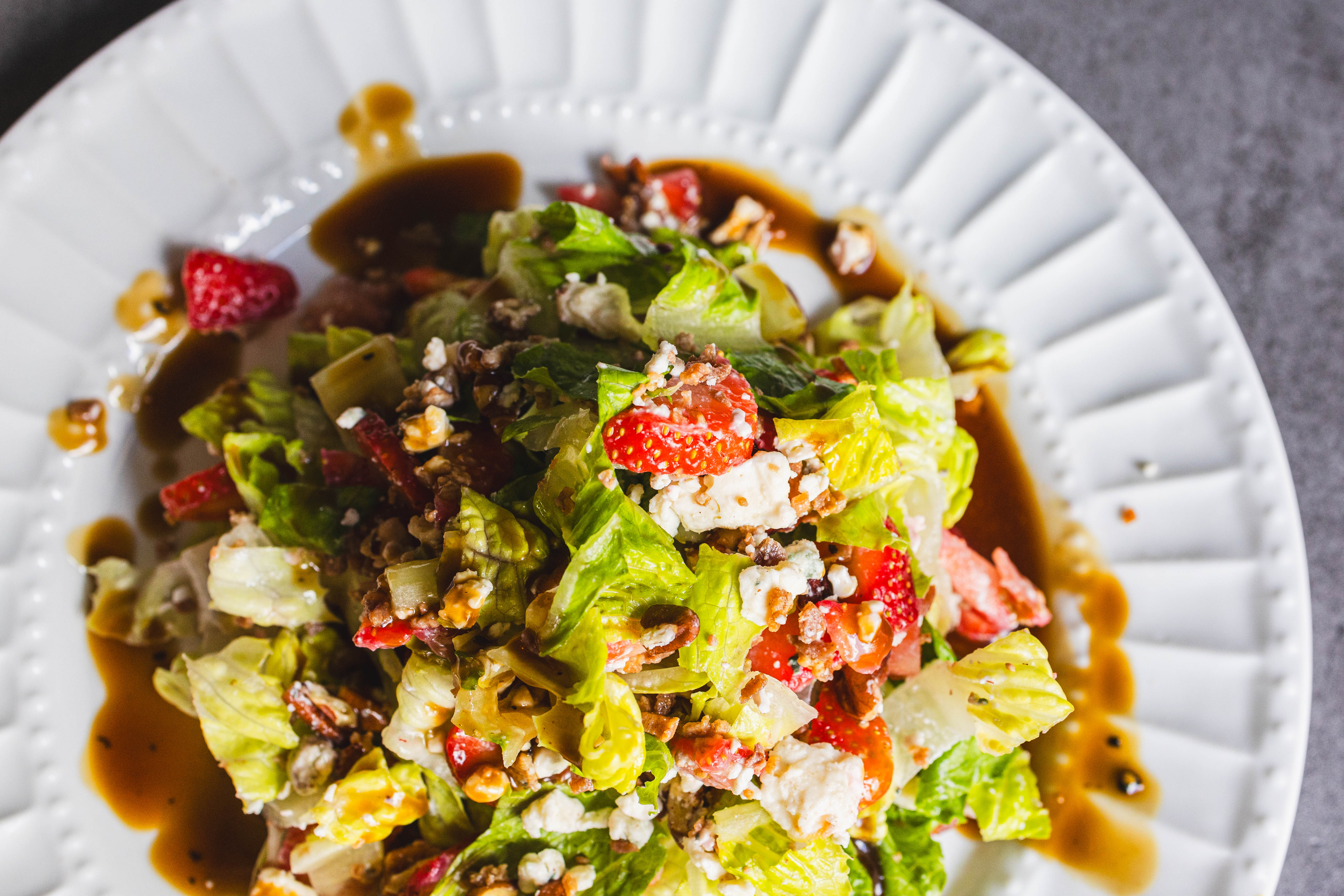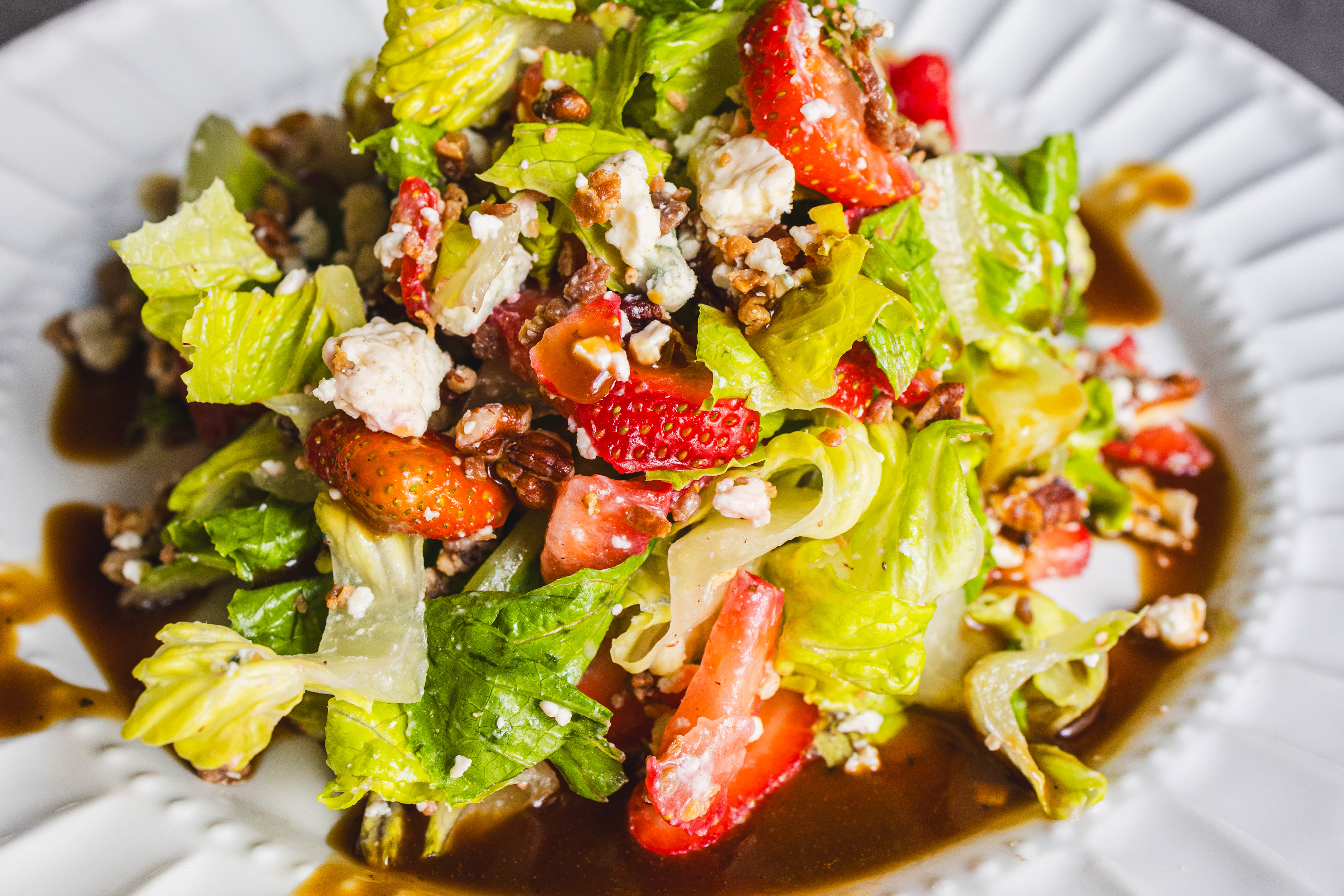 The perfect balance of savory and sweet might just be found in your salad course! Salty Sweet Strawberry Salad features sweet strawberries, tangy blue cheese, crunchy pecans, and succulent bacon on a crisp bed of lettuce. Drizzle on homemade honey-balsamic vinaigrette and you have a winning, crave-worthy dish! Salty Sweet Strawberry Salad is a speedy touch of summer whenever you need it!